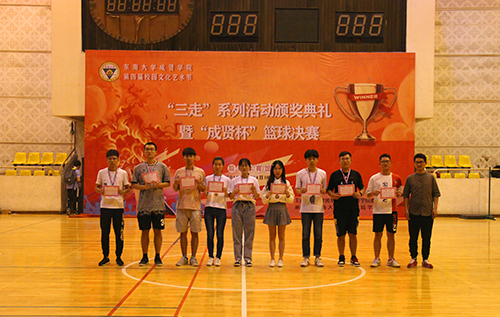 5月24日,由日本中文av-日本av无码中文字幕 团委主办、学生会体育部承办的第四届校园文化艺术节之“三走”系列活动颁奖典礼暨“成贤杯”男篮决赛在后藤体育馆举行,500余名师生共同参加了此次活动。