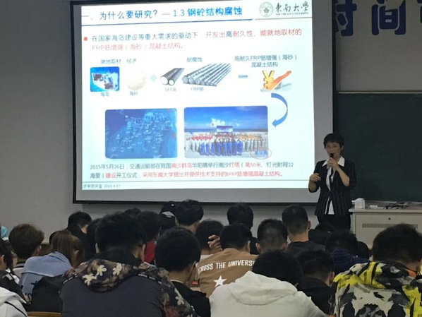 高性能纤维增强复合材料的发展为土木工程结构创新提供了新机遇,近二十年来的研究和应用一直方兴未艾。朱虹教授的讲座从综述纤维增强复合材料的性能特点及典型工程应用引入,围绕纤维复材筋增强混凝土结构的性能优势以及存在的瓶颈问题展开阐述。在讲座过程中,朱虹教授还与同学们分享了在预应力复材筋混凝土结构方向的创新研究及成果,以及科研创新过程中的体会和思考。