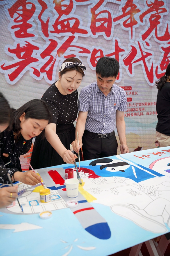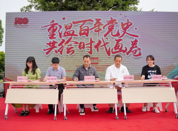 本次活动分为四个环节:签订共建协议、重温入党誓词、文艺展演为党献礼、共绘时代长卷。活动伊始,各联合单位签订“红色联盟”共建协议书。随后,各联合单位的新老党员面向党旗,庄严宣誓,重温入党誓词。接着,来自南京博爱幼儿园的小朋友们和社区文艺团体给大家带来了精彩的表演,共同为党庆生。广场上同时还展出了众多精美的绘画书法作品,分别来自我院的学生、社区退休书画爱好者以及幼儿园的孩子们。