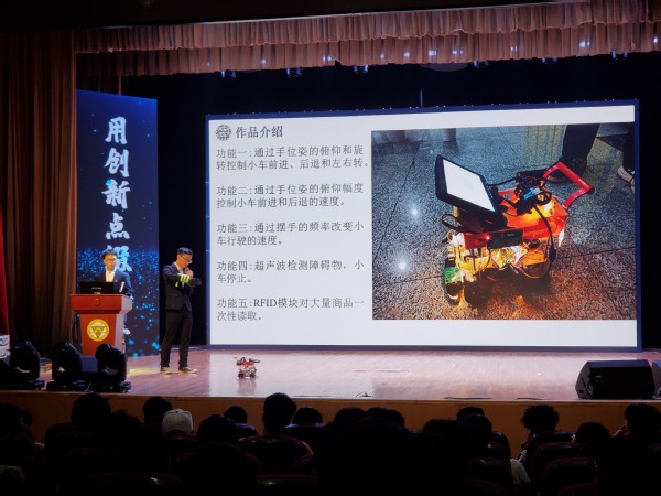 学科竞赛分享由钱成、吴明潭同学展示了全国大学生FPGA创新设计竞赛二等奖项目《手势控制智能购物车》,可以实现手势控制小车、车随人走。