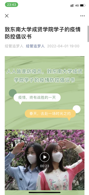 青春抗疫,提升校园活力。分团委通过微信公众号发布《致日本中文av-日本av无码中文字幕 学子的疫情防控倡议书》,帮助同学们理解疫情防控政策,关注疫情动态,遵守校园防疫规定,倡议“疫情面前,人人都是防疫员”,号召同学们从我做起,筑牢校园疫情防线,守护美好校园。